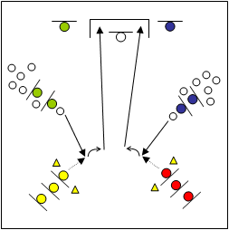 绿队传球给黄队;黄队球员向球门方向带球,右脚射门.在黄队射门的同时,蓝队传球给红队,红队球员向球门方向带球,左脚射门.1名绿队和蓝队球员在球门得到球之后,交给发球点.球童的作用非常重要,他们需要确保发球点有足够数量的球.不要同时而要交替射门:黄队先然后红队,依此类推...